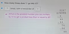 The largest multiple of 11 that is less than or equal to 40 is 33. The next multiple, 44, is too large. This means that 11 goes into 40 a total of 3 times. This number is called the quotient. The image provides a supporting question, “What is the greatest number you can multiply by 11 to get a product less than or equal to 40?”, which directly guides us to this answer of 3.