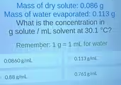 Next, we need the volume of the solvent. The problem provides the “Mass of water evaporated” as 0.113 grams. In this experimental setup, the evaporated water was the original solvent for the solute. The question requires the volume of the solvent in milliliters (mL), not its mass in grams. Fortunately, a crucial piece of information is supplied: “Remember: 1 g = 1 mL for water.” This is a simplified expression of water’s density, allowing for a direct conversion. Using this relationship, the mass of 0.113 grams of water is equivalent to a volume of 0.113 milliliters. This value will be the denominator in our calculation. The stated temperature of 30.1 °C provides context for the experiment but is not needed for the calculation itself, since the simplified density was already given.