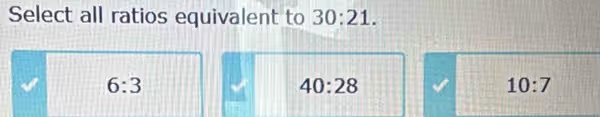 So, the simplest form of the ratio 30:21 is 10:7. Any ratio that also simplifies to 10:7 will be equivalent.