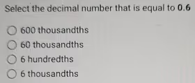Therefore, “600 thousandths” is the only choice that is numerically equivalent to 0.6.