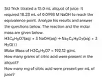 To answer the first question, we convert these moles of citric acid into grams using its molar mass (192.12 g/mol ):