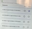 To accurately determine whether each statement is true or false, we must first understand the relationship between miles and kilometers. These are both units of length, with one mile being a longer distance than one kilometer. The key to solving these problems is using the correct conversion factor. For general approximation, the most common conversion used is that 1 mile is approximately equal to 1.6 kilometers. This simple factor is the basis for evaluating all the statements.