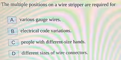 This is why wire strippers have multiple positions. Each hole or notch on the jaws of the tool is precisely machined to match a specific wire gauge. The positions are typically labeled with the corresponding gauge number (e.g., 10, 12, 14, 16). By selecting the correct position for the wire being used, a person can ensure a clean, safe, and precise cut through the insulation only, leaving the conductor completely intact and ready for connection. The other options are incorrect because the tool’s positions are related to the physical dimensions of the wire, not electrical regulations, user hand size, or the connectors used afterward.