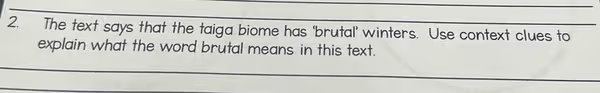To understand that “brutal” means extremely harsh or severe, a reader must use context clues, which are the surrounding words and sentences in the text. Although the full text is not provided, we can infer the types of clues that would lead to this definition. The question is about the taiga biome, a region known for its very challenging climate.