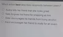 The other options, while describing important aspects of friendship, do not fit the definition of reciprocity as well. Nate forgiving his friend is an act of grace and conflict resolution, not a mutual exchange. Forgiveness is a response to a negative action, not a behavior that is typically traded back and forth. Similarly, Slate discouraging friends from trying alcohol and Karol encouraging a friend to study are acts of guidance, support, or positive peer influence. These are generally one way supportive actions in a specific moment. While a good friendship involves mutual support over time, these individual acts do not represent the direct, reciprocal exchange that the term implies. The compliment is the clearest instance of a social gesture that is given with the implicit social expectation of being returned in kind.