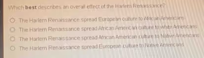 The correct answer is: The Harlem Renaissance spread African American culture to white Americans.