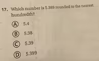Let’s consider why the other options are incorrect. Option (A) 5.4 is the result of rounding 5.389 to the nearest tenth, not the hundredth. Option (B) 5.38 would be the answer if we were to round down or truncate, which is incorrect because the deciding digit, 9, requires us to round up. Option (D) 5.399 has not been rounded to the hundredth place at all. Thus, 5.39 is the only correctly rounded number.