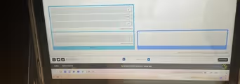On the screen, a web page or a software application is open. The interface appears to be a form for data entry or a configuration panel. There are several distinct rectangular fields. A larger box on the left contains multiple horizontal lines, suggesting a list or a multi-line text area with checkboxes. Below it and to the right are other input boxes highlighted with blue borders. The use of color-coded borders, particularly the prominent blue outlines, likely indicates active or selected fields where a user can input information.