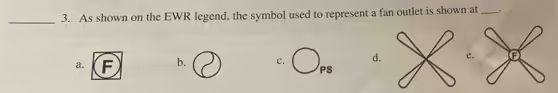 The symbol shown in option ‘a’ is the standard representation for a fan outlet on electrical blueprints and wiring diagrams, often found in an EWR (Electrical Wiring Residential) legend. This symbol is designed to be clear and concise, providing electricians with essential information for installation.