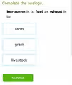 - Farm: A farm is the location where wheat is grown. This establishes a relationship of “product to its place of origin,” which does not match the relationship between kerosene and fuel.