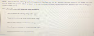 Paula demonstrated good initial practices by performing hand hygiene and putting on gloves, which are crucial first steps for infection control. Her primary error occurred in the sequence of her wound care. A bleeding mole removal site constitutes an open wound, creating a direct pathway for pathogens to enter the body. The fundamental principle of wound care is to protect this compromised area from contamination.