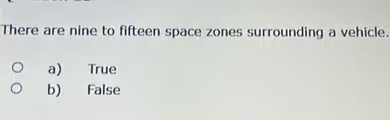 The statement that there are nine to fifteen space zones surrounding a vehicle is false. This number is inconsistent with the standard models taught in most defensive driving and driver education curricula. The most widely recognized and utilized framework for managing the space around a vehicle is the Zone Control System, which outlines six, not nine to fifteen, distinct zones.