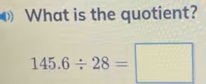 To find the quotient for the problem 145.6 ÷ 28, we can use the method of long division. The quotient is the result obtained from dividing one number by another. In this problem, 145.6 is the dividend (the number being divided) and 28 is the divisor (the number we are dividing by).