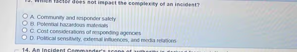 - A. Community and responder safety: Any threat to the safety of the public or the first responders, such as an unstable structure, ongoing violence, or severe weather, immediately elevates the complexity. It requires more careful planning, specialized safety protocols, and additional resources to mitigate the risks.